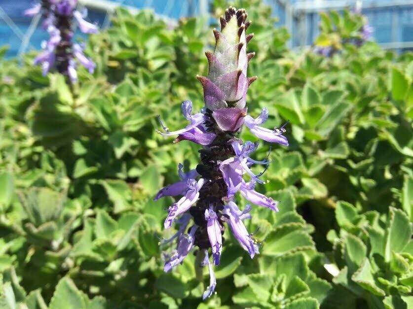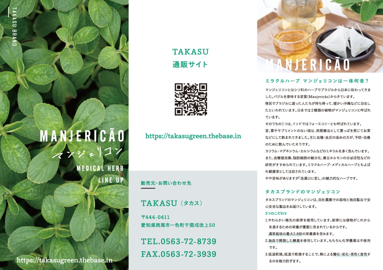 マンジェリコンとは、シソ科のハーブ(多年草)です。原産地は諸説ありますが、インド、南アジア、アフリカ東部、オーストラリア、などといわれています。日本へはブラジルから伝わってきました。ブラジルの言葉でバジル(Manjericão)を意味します。日本では2種類があり、葉っぱを煎じてお茶などにして飲まれてきました。