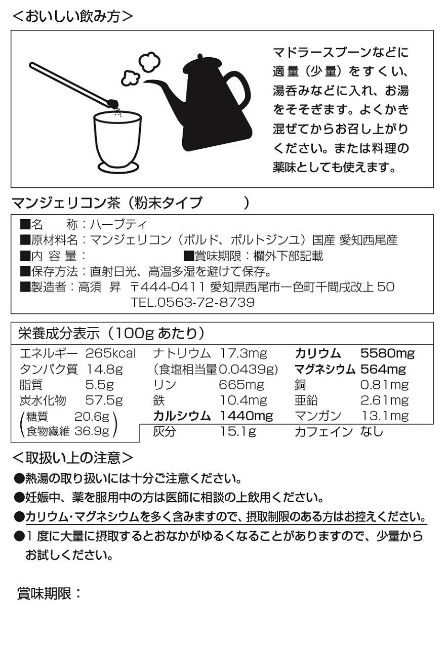 マンジェリコンは一般的な緑茶に比べて、カリウム、カルシウムなどのミネラルが豊富で、特にカリウムは緑茶の2.5倍と多く含んでします。ノンカフェインです。