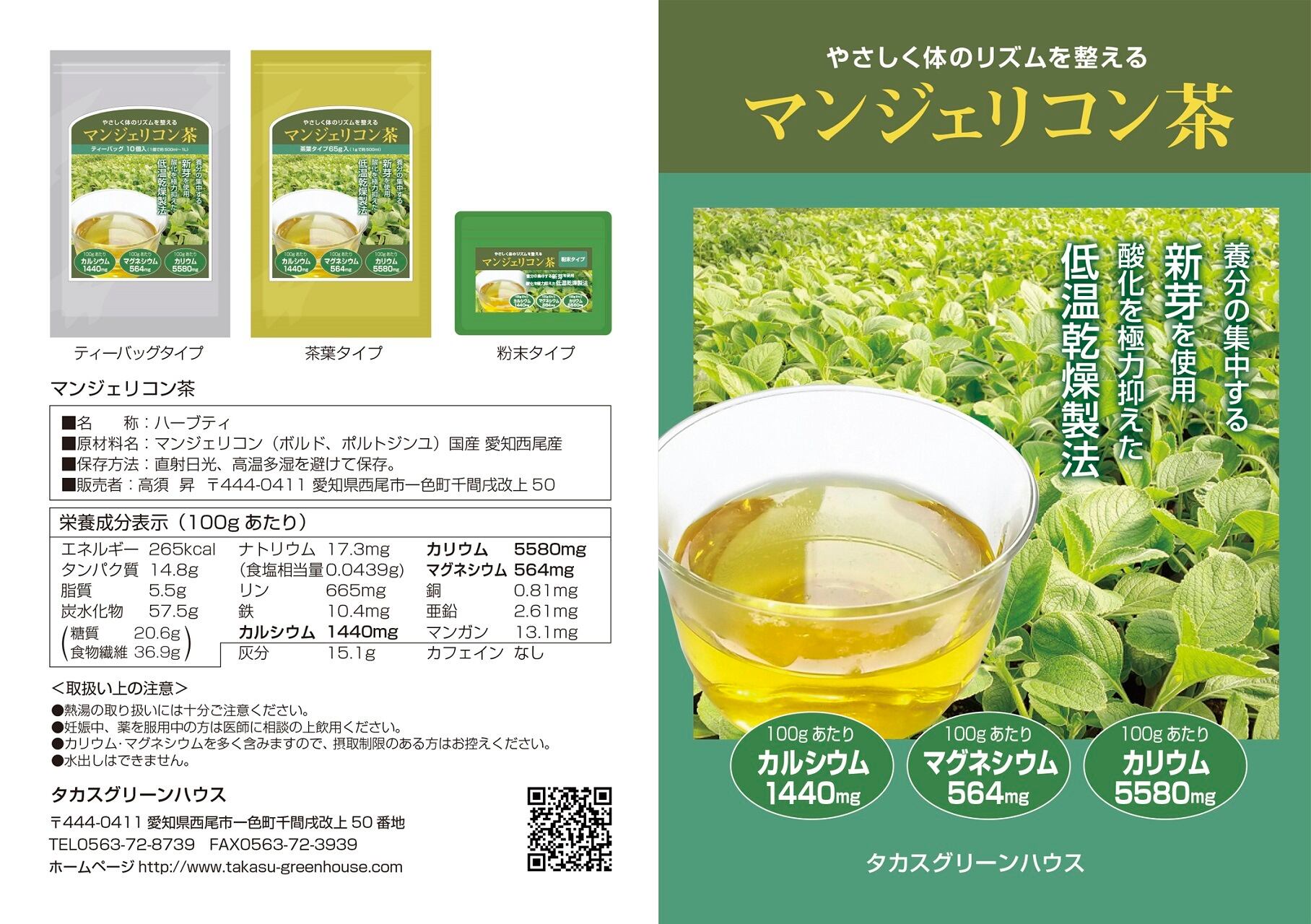 マンジェリコンとは、シソ科のハーブで日本へはブラジルから伝わってきました。日本では2種類が自生しています。昔は民間療法で使われていて、主に血糖・血圧の高めの方が葉っぱを煎じてお茶として飲んでいたそうです。カリウム・マグネシウム・カルシウムなどミネラルを多く含む健康茶です。