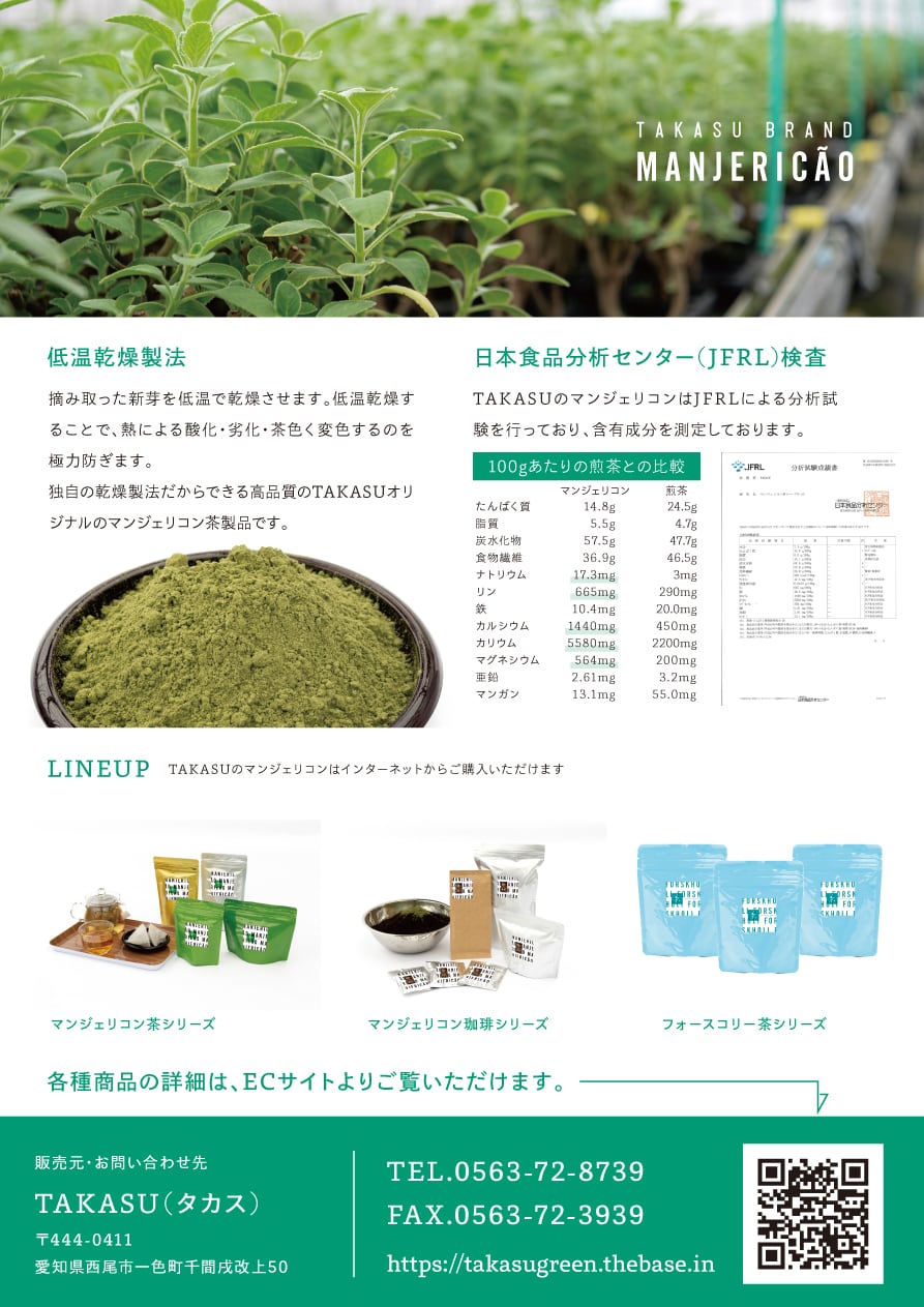 タカス農園では養分の集中する穂先の新芽を使用しています。新芽には植物がこれから生長するための栄養が豊富に含まれているからです。また、独自の低温乾燥で熱による酸化・劣化、茶色く変色するのを極力抑えています。