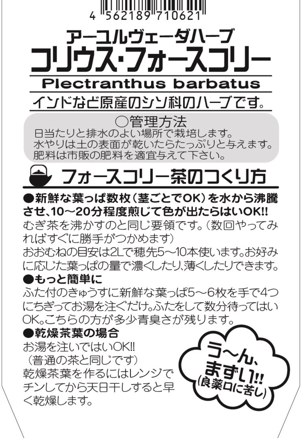 インドなど原産のシソ科のハーブ。インドではコレウス・フォースコリーと呼ばれていてアーユルヴェーダー(伝統医学)で使われているハーブです。ダイエットサプリメントなどの原料としても使われているハーブです。